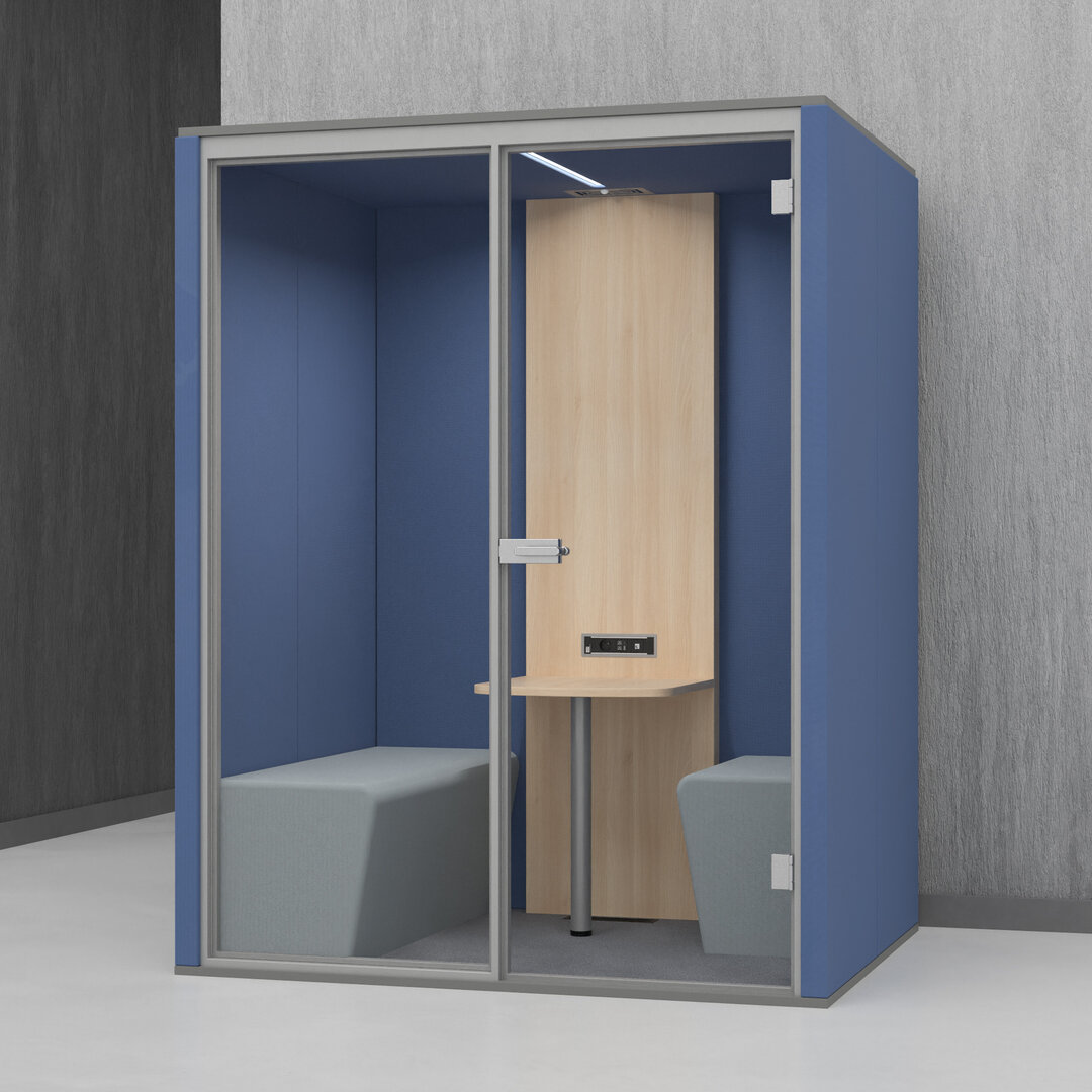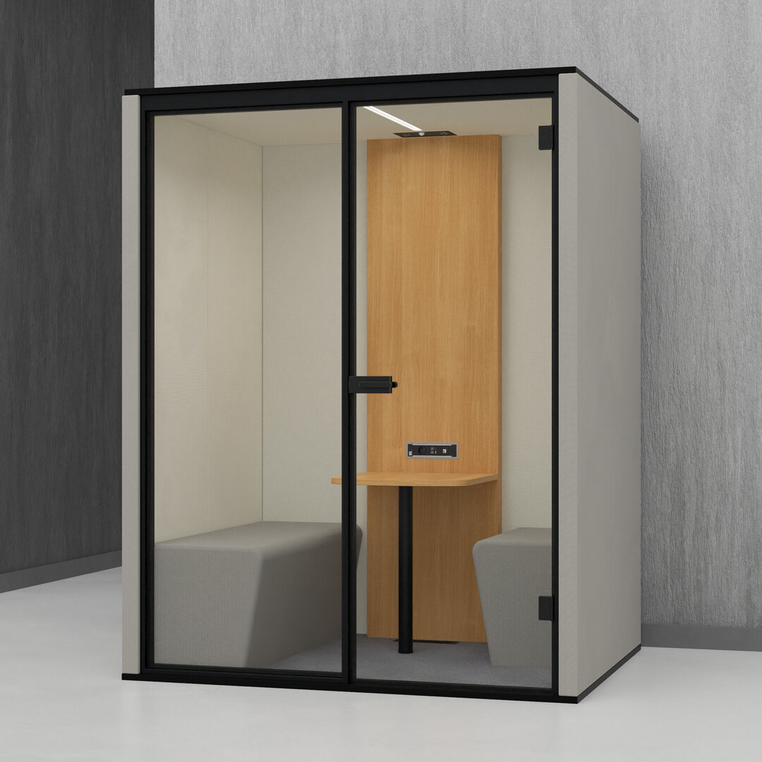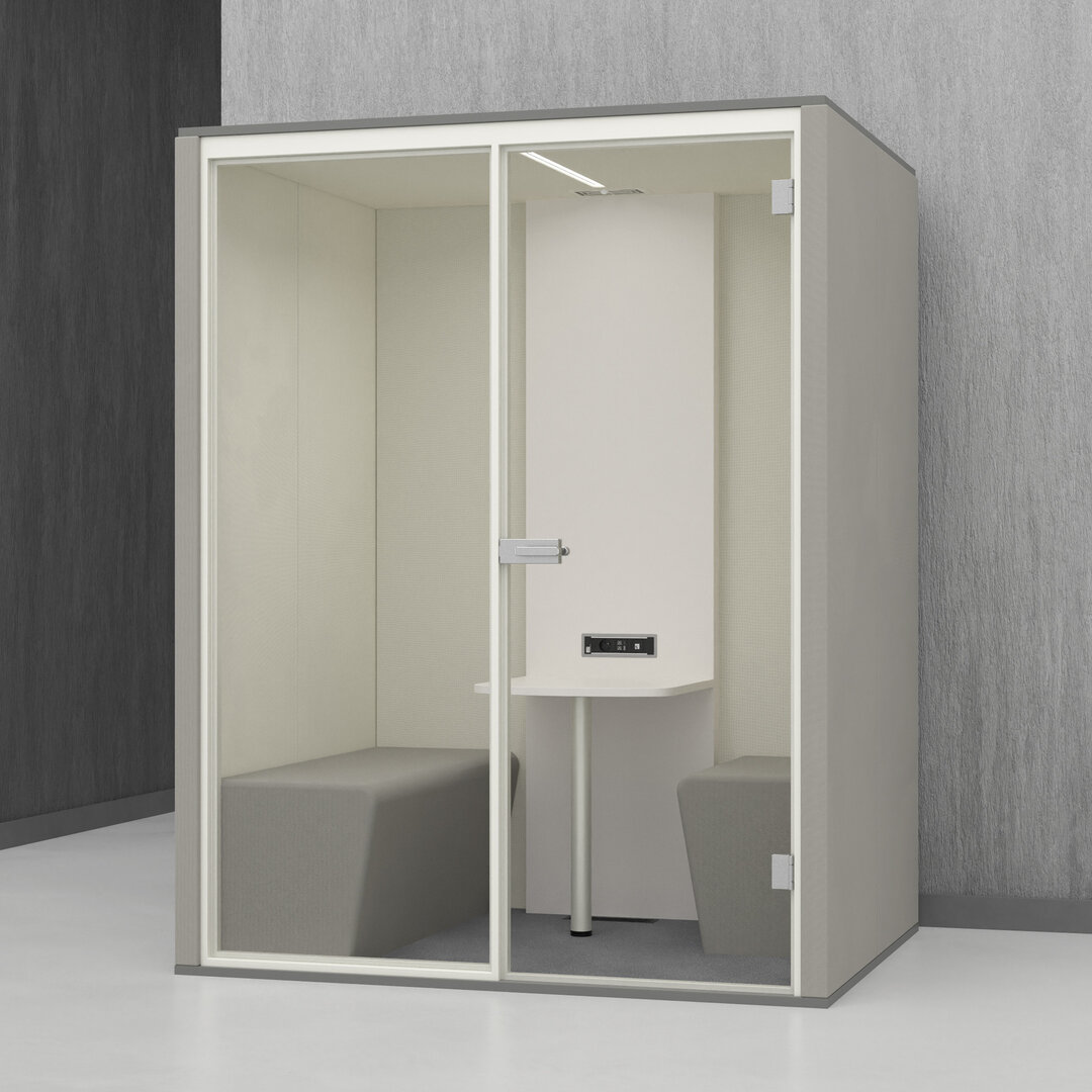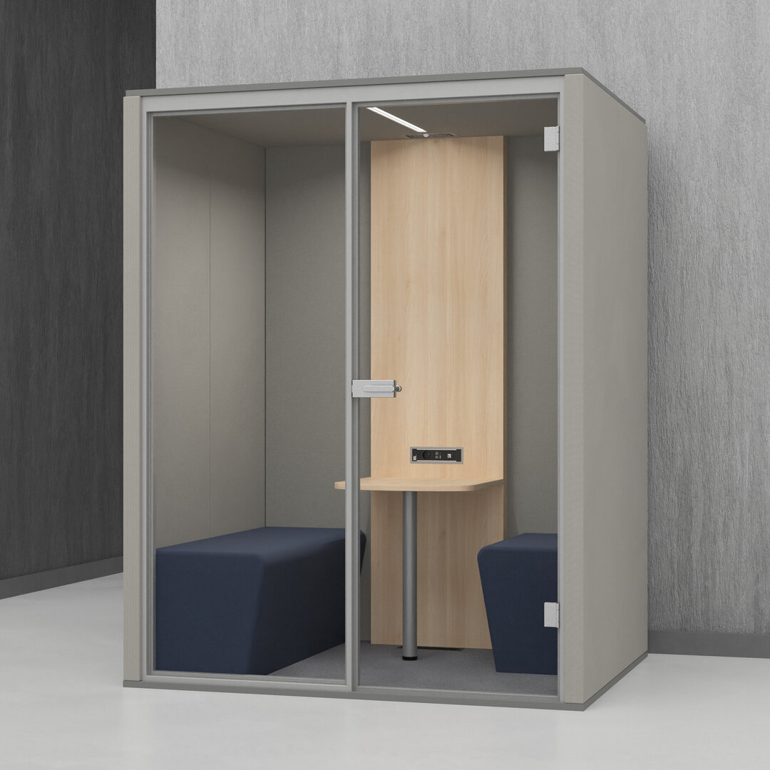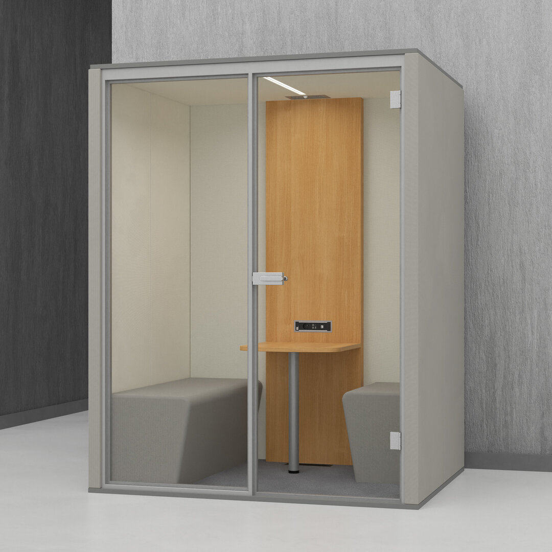 - Zur Grundausstattung gehören ein Tisch und ein Anschlusspaneel mit Steckdose, USB-Ladeanschluss und LAN-Anschluss. Optional ist ein gepolsterter Sitz erhältlich.