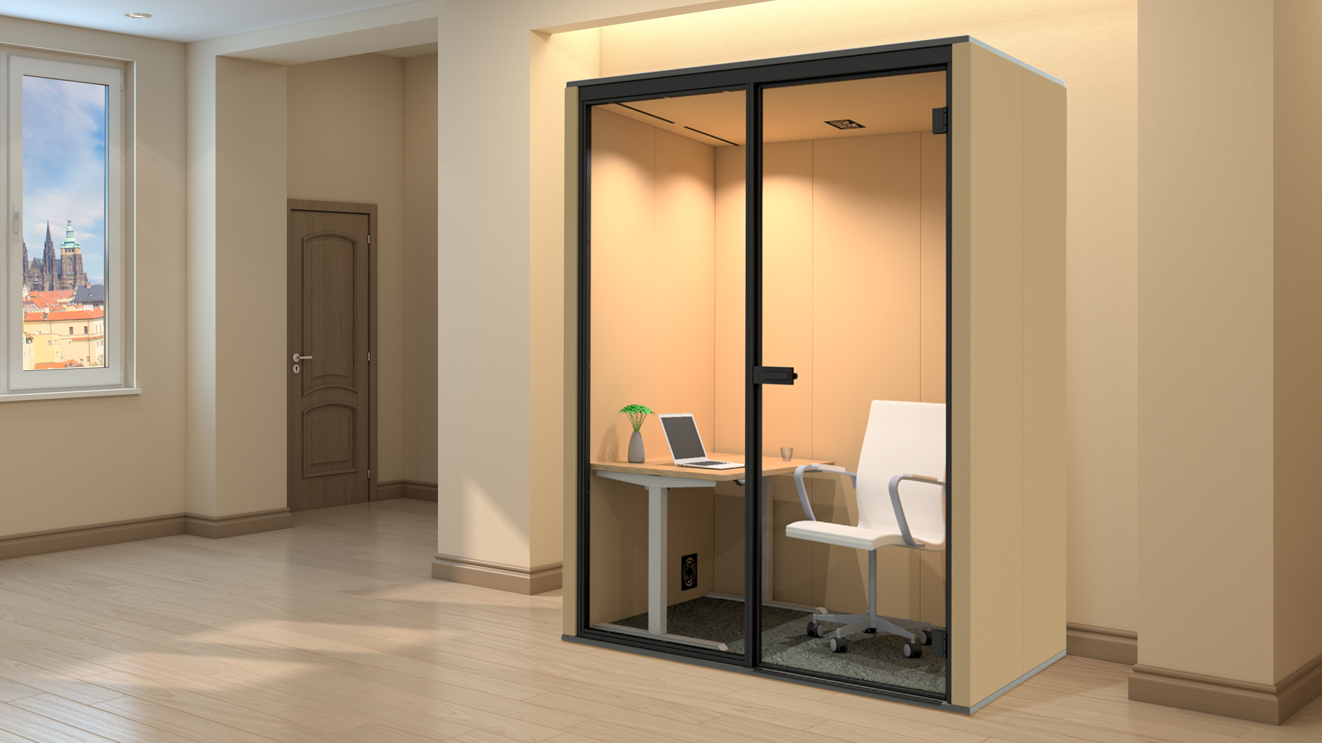 - Die Sandwichplatte mit akustischer Füllung schafft einen geräuschlosen Ort innerhalb der Box.