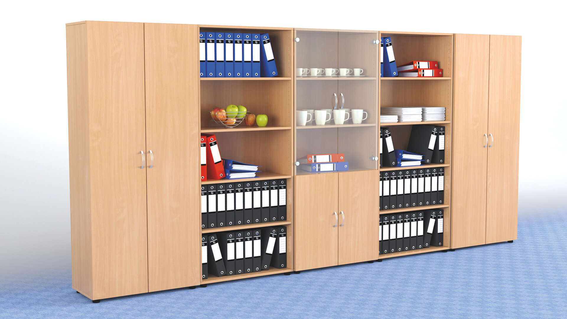 Kancelářské skříně HOBIS - řada DRIVE - sestava se středními a nízkými skříněmi